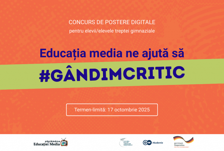 Centrul pentru Jurnalism Independent (CJI) și DW Akademie invită elevii și elevele claselor gimnaziale să participe la concursul de postere digitale „Educația media ne ajută să #gândimcritic”. Competiția este lansată în contextul Săptămânii Globale a Educației Media, marcată de UNESCO în luna octombrie 2025.